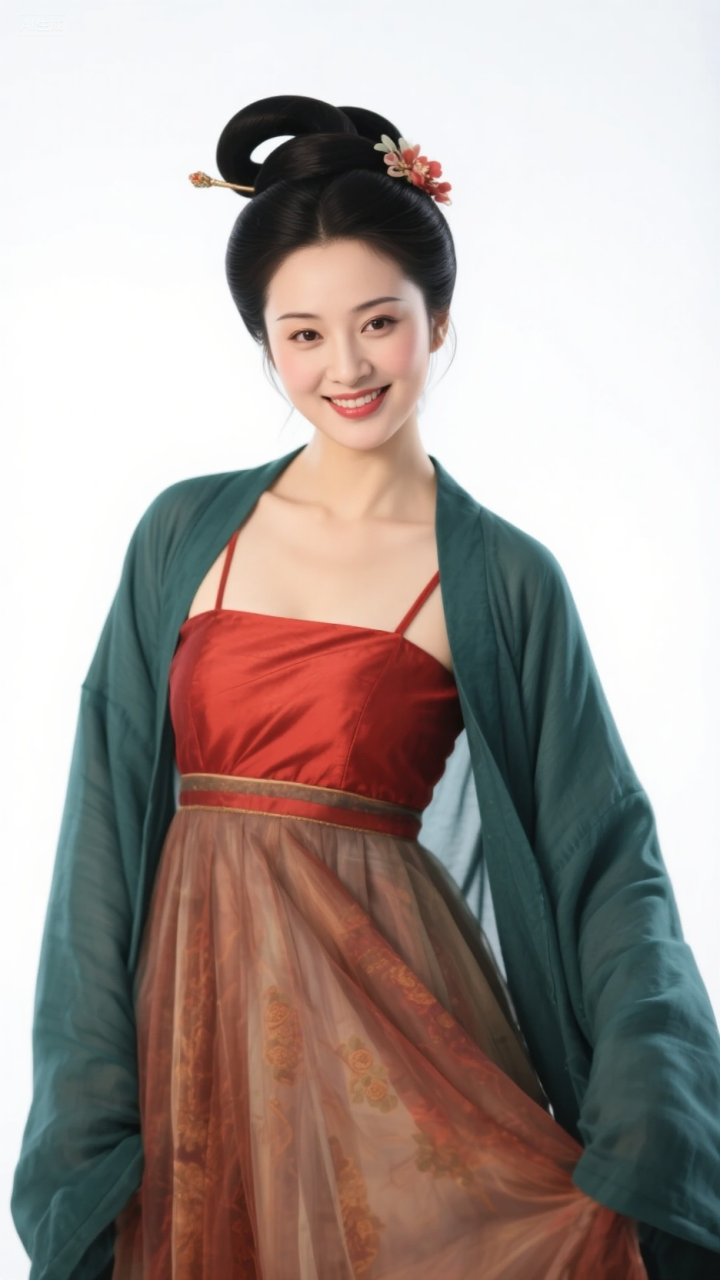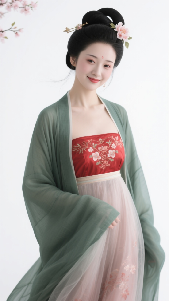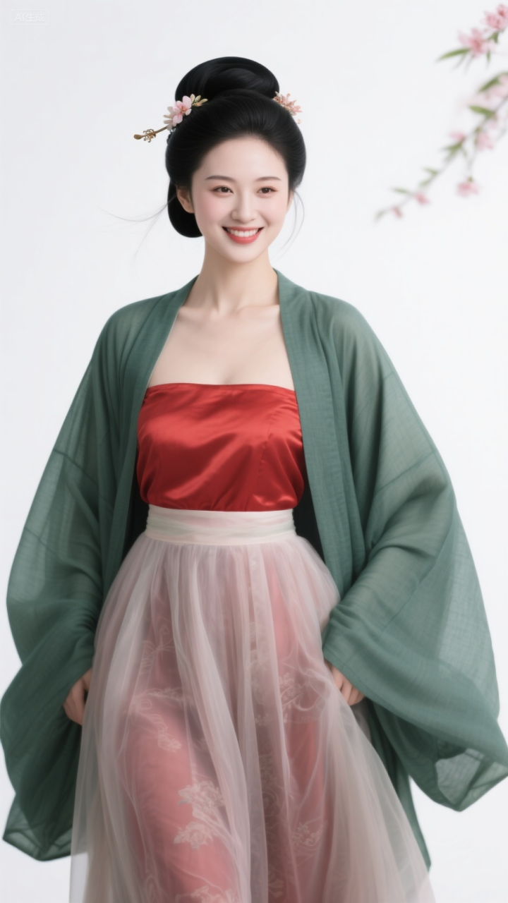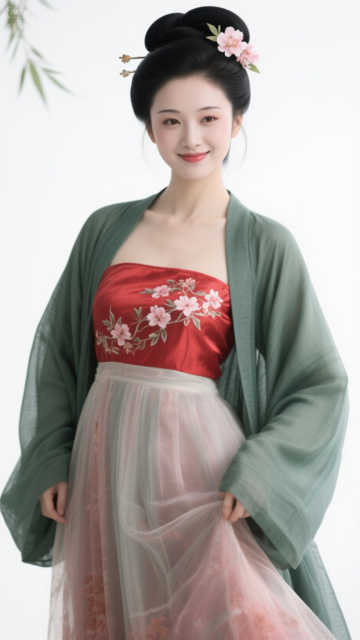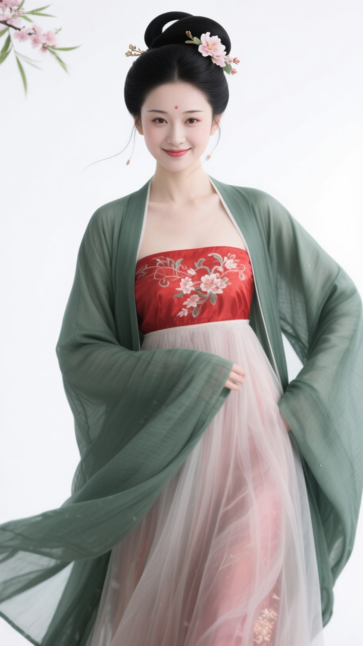 毛青衫配红抹胸, 柳眉桃脸