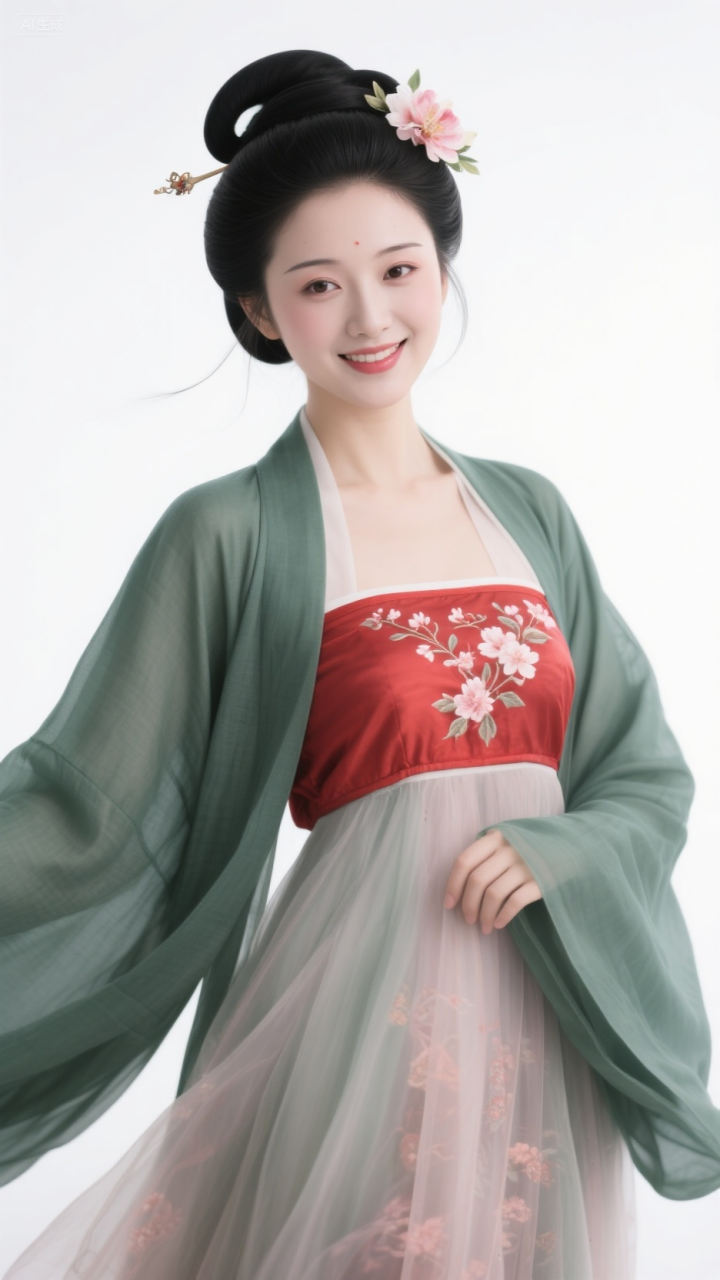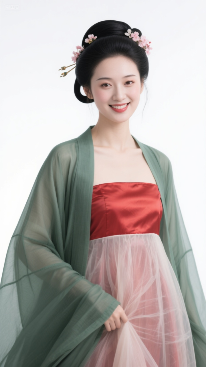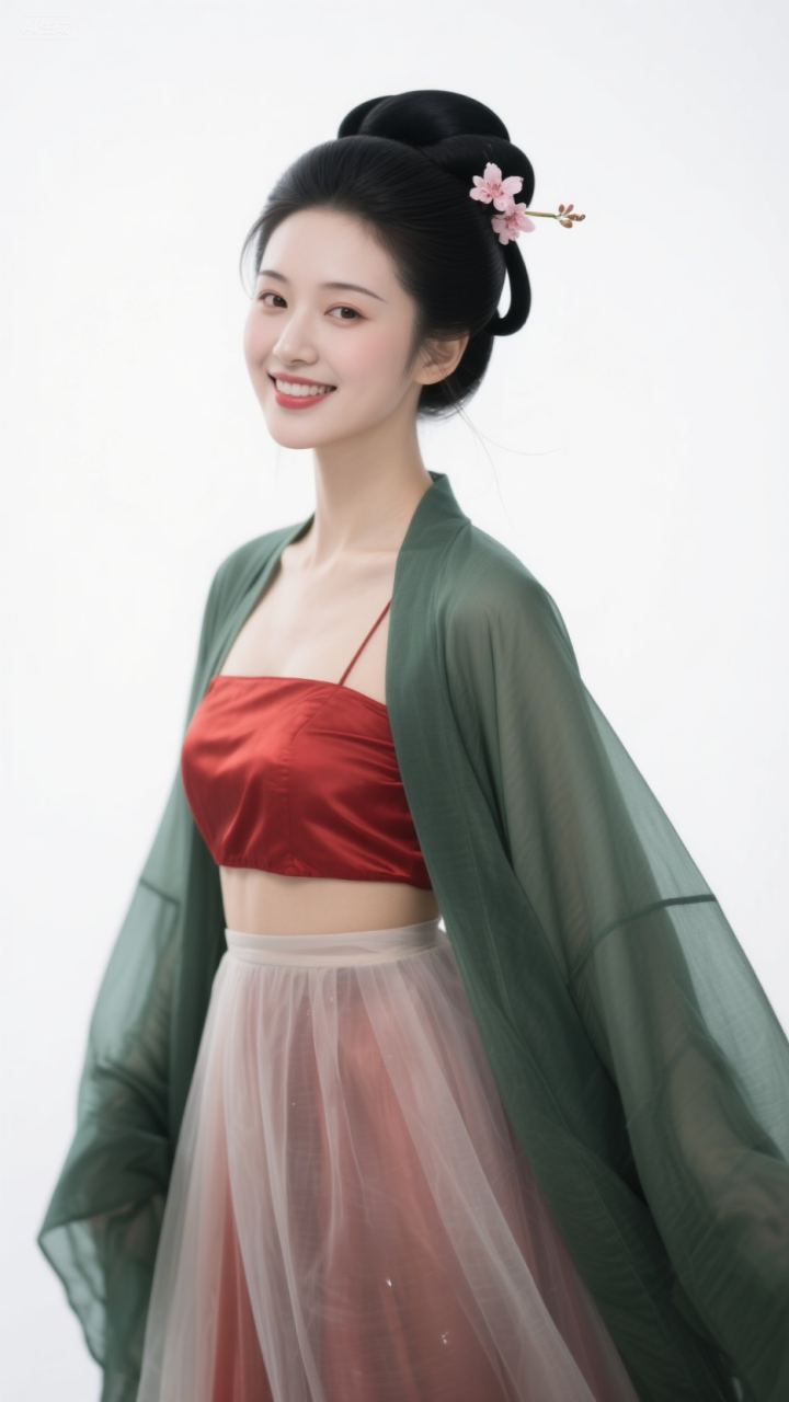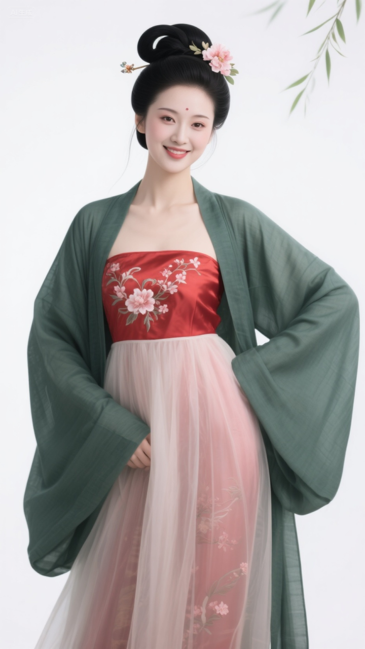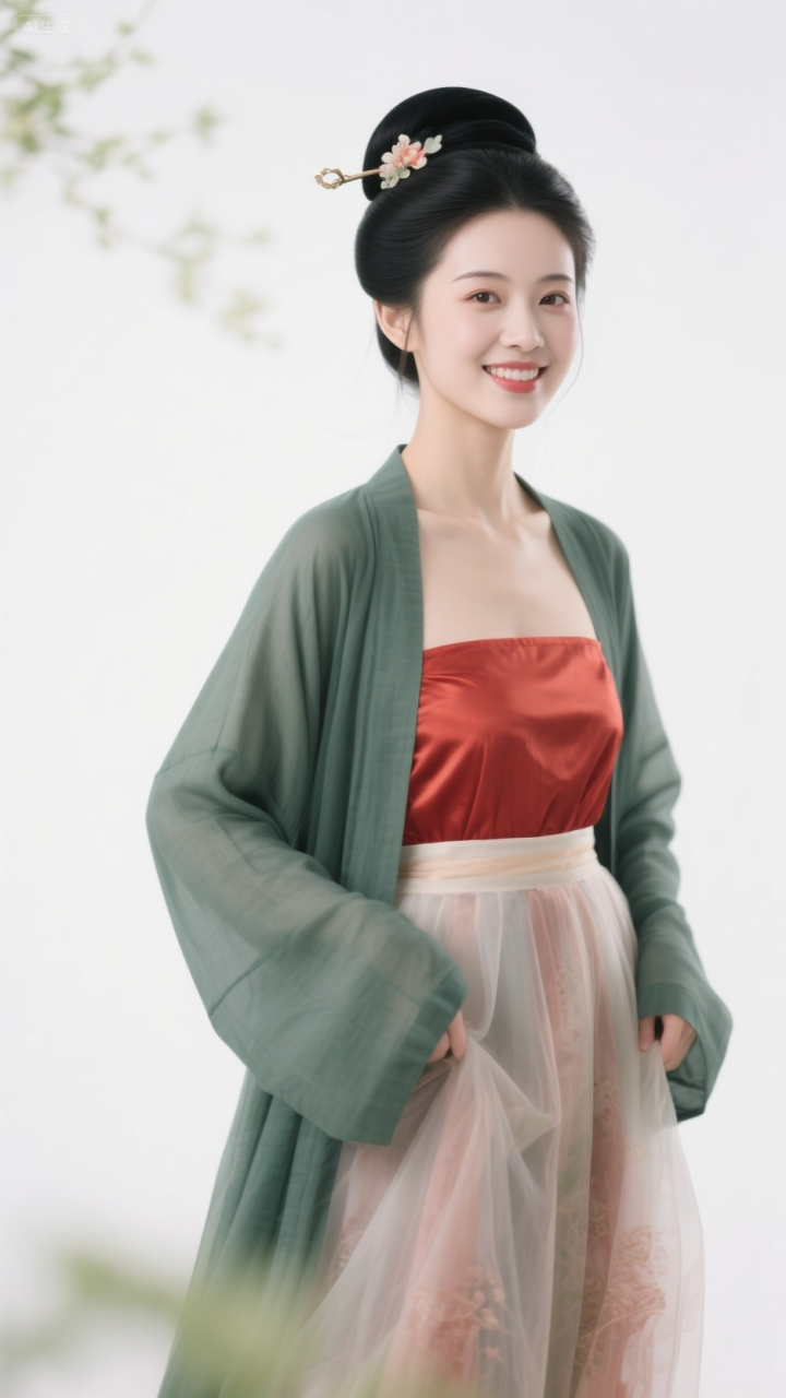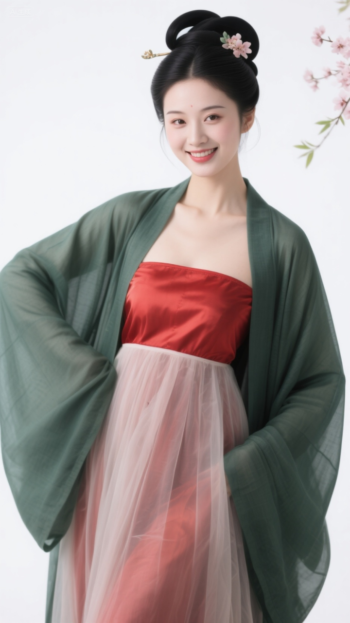 毛青衫配红抹胸, 柳眉桃脸